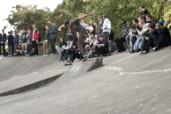 Nachdem das Curb mit Tricks versorgt war und auch das Hausdach-Obstacle zuhauf an harten Manövern abbekommen hatte, zeigte sich zum Abschluss dann die Bank to Quarter Kombination als der bevorzugte Spot.