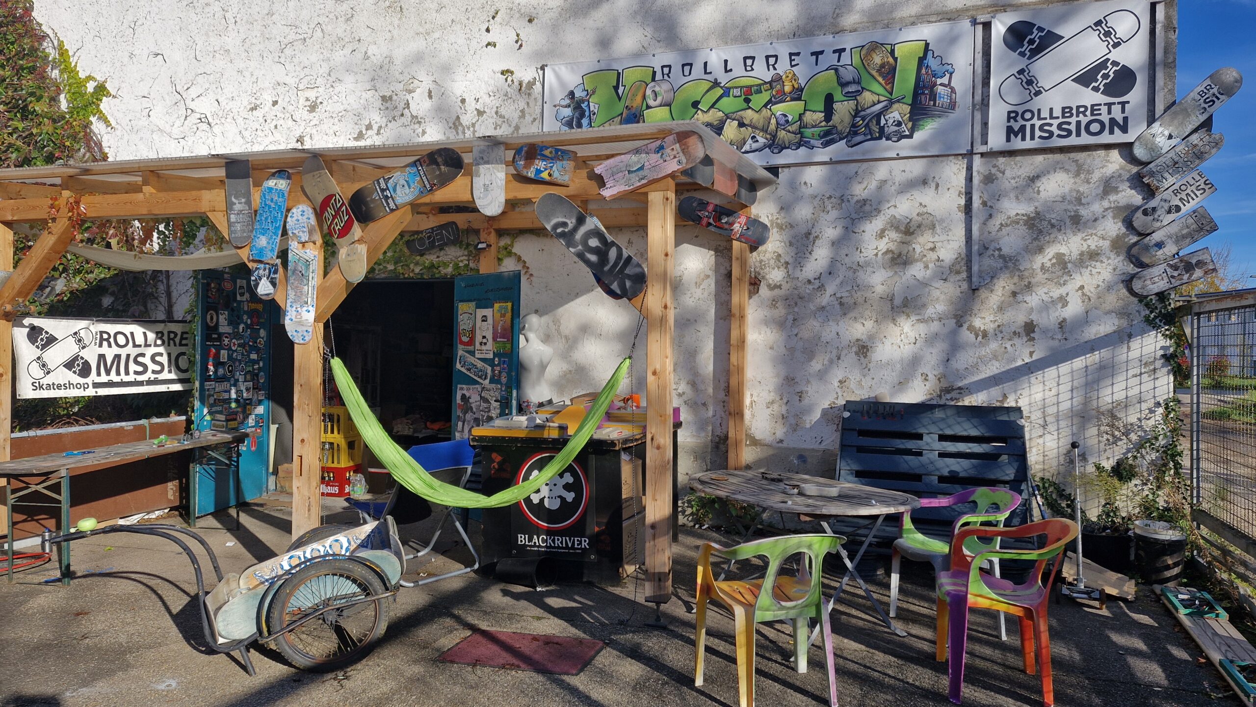 2008 kam dann mein erstes Kind – und mein eigener kleiner Skateshop: die erste ROLLBRETT MISSION im Bahnhofsgebäude von Emmendingen bei Freiburg. Das ging bis 2013 mehr oder weniger gut. Dann dachte ich: Muss ja mal vernünftig werden, anständiger Job, Familie ernähren, feste Arbeitszeiten, ein bisschen Karriere machen … und habe als Online-Fuzzi für verschiedene Firmen in der Elektronikbranche gearbeitet. Dieses Büroleben hat für mich nicht funktioniert. Irgendwann während der Coronazeit kam die Vollkrise, private Probleme dazu, ich habe alles hingeworfen und konnte ein ganzes Jahr lang praktisch nichts tun – außer depressiv im Bett liegen. Glücklicherweise habe ich mich noch regelmäßig zum Skaten überwinden können. Danke, Skateboarding!