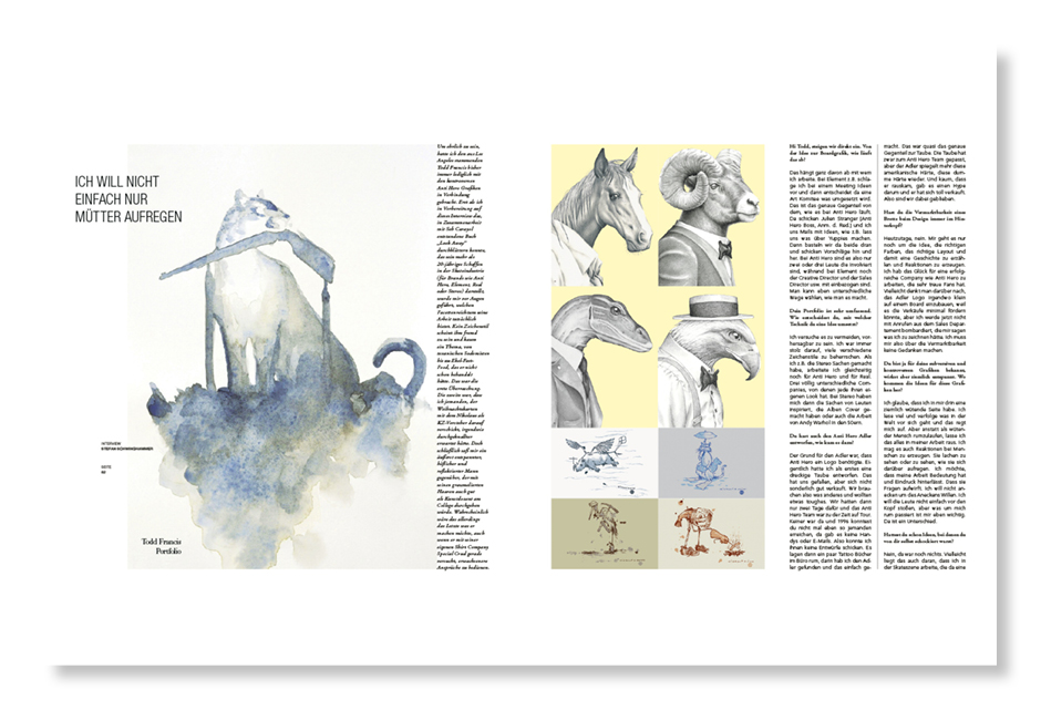 Um ehrlich zu sein, hatte ich den aus Los Angeles stammenden Todd Francis bisher immer lediglich mit den kontroversen Anti Hero Grafiken in Verbindung gebracht. Erst als ich in Vorbereitung auf dieses Interview das, in Zusammenarbeit mit Seb Carayol entstandene Buch „Look Away“ durchblättern konnte, das sein mehr als 20-jähriges Schaffen in der Skateindustrie (für Brands wie Anti Hero, Element, Real oder Stereo) darstellt, wurde mir vor Augen geführt, welchen Facettenreichtum seine Arbeit tatsächlich bietet. Kein Zeichenstil scheint ihm fremd zu sein und kaum ein Thema, von texanischen Sodomisten bis zu Ekel-Fast-Food, das er nicht schon behandelt hätte. Das war die erste Überraschung. Die zweite war, dass ich jemanden, der Weihnachtskarten mit dem Nikolaus als KZ-Vorsteher darauf verschickt, irgendwie durchgeknallter erwartet hätte. Doch schließlich saß mir ein äußerst entspannter, höflicher und reflektierter Mann gegenüber, der mit seinen graumelierten Haaren auch gut als Kunstdozent am College durchgehen würde. Wahrscheinlich wäre das allerdings das Letzte was er machen möchte, auch wenn er mit seiner eigenen Shirt Company Special Crud gerade versucht, erwachsenere Ansprüche zu bedienen.