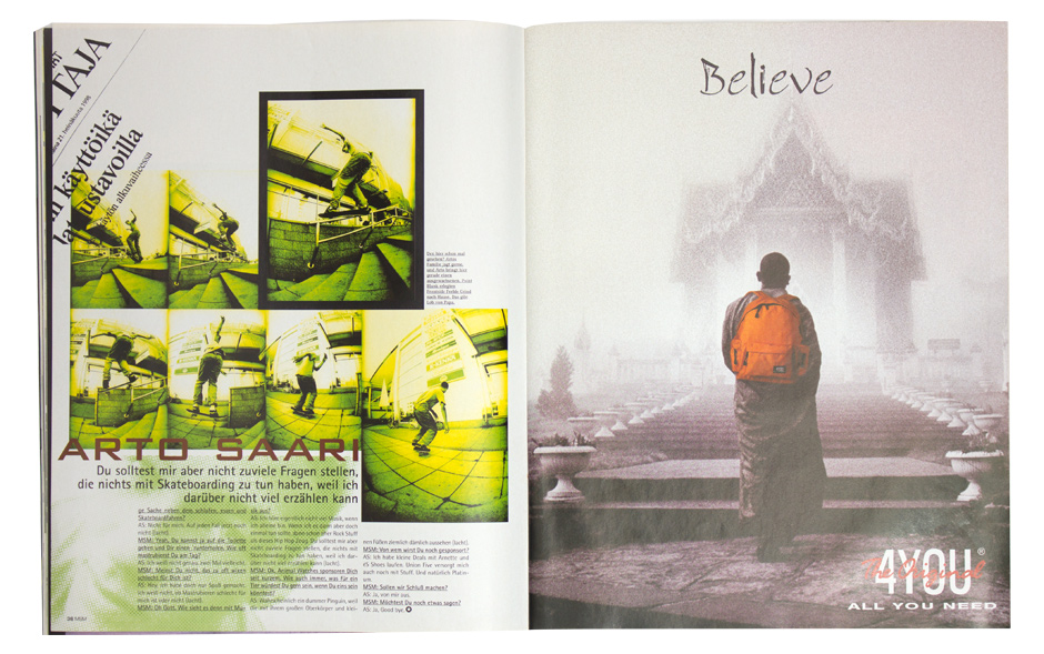 Hmm, Skateboarding ist, neben schlafen und essen, das wichtigste in meinem Leben. Vielleicht fernsehen oder so. X-Files finde ich ganz cool, Melrose Place oder die Simpsons. Das Dumme ist nur, dass die Simpsons zu einer beschissenen Zeit ausgestrahlt werden (In Finnland laufen sie Samstag Nachmittags und man kann wetten, das Arto zu dieser Zeit skaten ist, wenn draussen kein Tornado wütet oder kein Nuklearkrieg stattfindet).