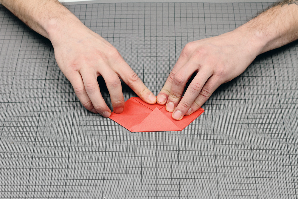 Du willst jetzt lieber Beer-Pong spielen? Ok. Alle Anderen lesen weiter. Alles wieder entfalten und dann die Seitenecken zur Mitte falten und wieder öffnen. Dann die Ecken nach innen falten (5-6).