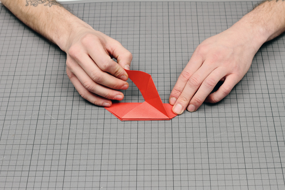 Jetzt wird’s hart. Alles auffalten und die Mitte falten. So dass ihr das Sechseck halbiert (10). Die oberen Ecken umfalten, so dass kleine Dreiecke sichtbar werden. Die Falz, also die neu entstehende Kante nach dem Falten, straffen und ein Flügel ist fertig (11).