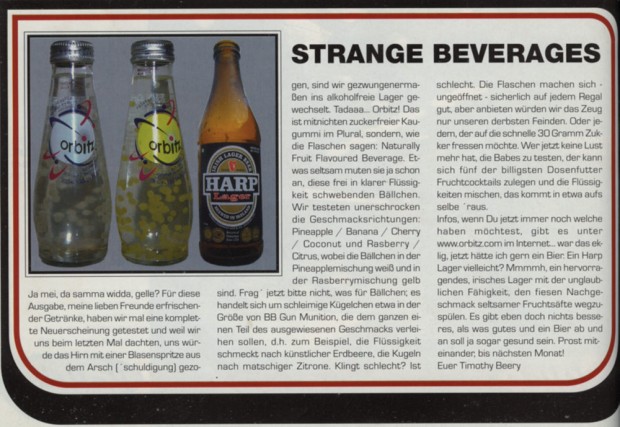 Obwohl die Redaktion unter diesen Beiträgen sicherlich nicht so sehr gelitten hat wie behauptet, wurden gelegentlich auch alkoholfreie Szenegetränke genauer begutachtet. So etwa „Orbitz”, das aussah wie schlimmster 90er Euro Dance in flüssig. Wer die Zeiten miterlebt hat, der weiß vielleicht noch um die eklig glibberige Konsistenz der Kügelchen und verspürt bei betrachten des Bildes eine flaue Erinnerung in der Magengegend, die sich durch die Speiseröhre Freiraum zu verschaffen sucht.