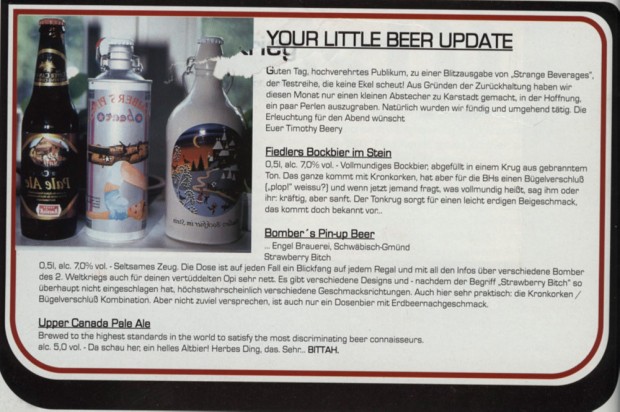 Im Jahre 1997 etwa fanden sich im Rahmen der News einige bemerkenswerte Empfehlungen. Unter dem Namen „Strange Beverages” wurden so köstliche Getränke wie „Fiedlers Bockbier im Stein” oder „Bomber’s Pin-Up Beer” einem eingehenden Test unterzogen.