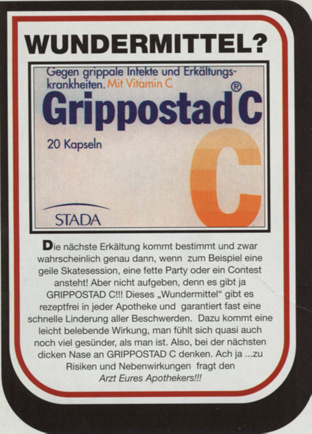 Da der Verzicht auf Alkoholisches kläglich scheiterte und man es in den 90ern wohl nicht all zu lange ohne Dröhnung aushalten wollte, stellten die Heftmacher in einer ähnlichen Rubrik auch gleich noch „Grippostad C” vor. Das sogenannte „Wundermittel” sollte gesünder machen als man ist, wurde einem versprochen und würde vor allem eine belebende Wirkung erzielen. War da die Pharamindustrie als Sponsor mit ins Boot geholt worden oder glaubte man tatsächlich an einen aufputschenden Effekt von Grippostad? Da war wohl jemand zu viel auf Underground Raves unterwegs, oder warum sonst sollte sich ein Skateboard Fachblatt auf Themengebiete der Apotheken Umschau vorwagen?