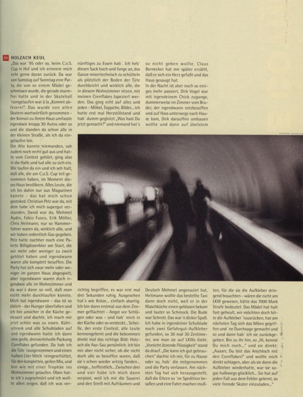 Was selbstverständlich in solch einem Rahmen nicht fehlen durfte, waren Storys von legendären Partyabenden. Unter Skateboardern wird schließlich gerne mit jeglichen Verzicht auf Nüchternheit die Sau raus gelassen, was unweigerlich zu berichtenswerten Eskapaden führt, die dann auch berichtet werden wollen – wäre doch viel zu schade wenn andere nicht am Spaß solcher Abende teilhaben könnten. In diesem Red Notebook Eintrag aus Ausgabe #152 ist es Holzach Keul, der von einer Party im Anschluss an einen C.O.S. Cup erzählt, die ein klein wenig aus dem Ruder lief…