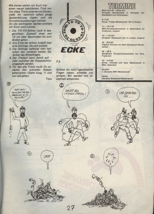 Seitensprünge der anderen Art gab es in den frühen Ausgaben der Monster noch relativ häufig. So hatten etwa Anleitungen zu Yo-Yo Tricks eine feste Rubrik im Heft. Mit Erklärungen wie, „Der Freilauf kann durch auf- oder zudrehen der Doppelschnur eingestellt werden” plus den ergänzenden Zeichnungen dürfte das Nachmachen auch relativ einfach gefallen sein. Schön auch, dass in den Terminen auf Frisbee Wettbewerbe aufmerksam gemacht wird.