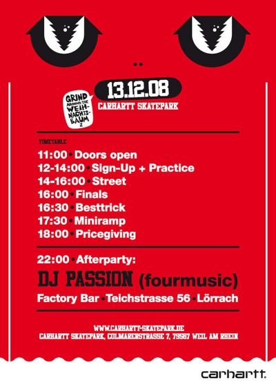 Wo wir gerade bei Carhartt sind: Am 13.12. findet der zweite “Grind around the Weihnachtsbaum” Contest in der Carhartt Halle in Weil am Rhein statt. Alle Daten könnt ihr dem Flyern entnehmen, alle weiteren Informationen findet ihr dann unter www.myspace.com/carhartt_skatepark.