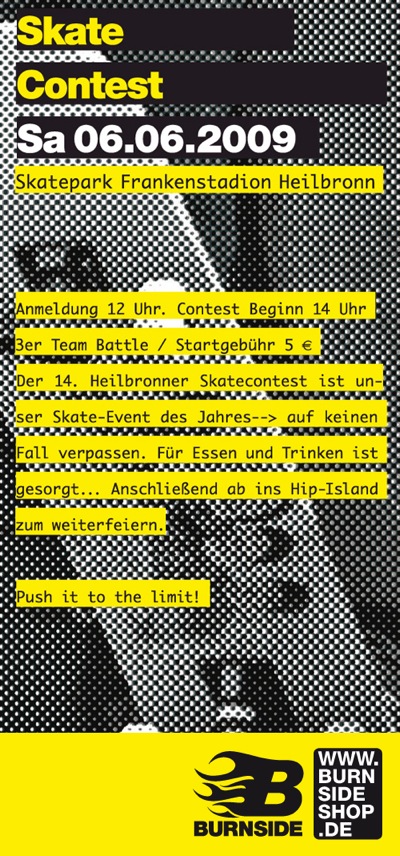 Am Samstag findet der 14. Heilbronner Skateboard Contest statt mit anschliessender Party. Geskatet wird in Dreierteams und für das leibliche Wohl ist ebenfalls gesorgt.