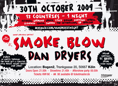 In Deutschland findet die Party im Bogen2 in Köln statt, mit Live-Musik von den “Dan Dryers” und den Jungs von “Smoke Blow”, danach geht’s nahtlos in die Aftershow Party über…