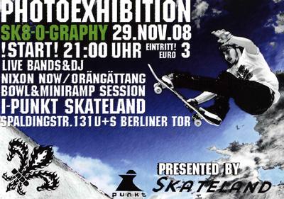Am 29.11. wird es in der I-Punkt Halle in Hamburg eine Photoausstellung von 13 Künstlern geben. Geskatet wird auch, allerdings nur Bowl und Halfpipe, da die Streetarea für die Ausstellung “missbraucht” wird.