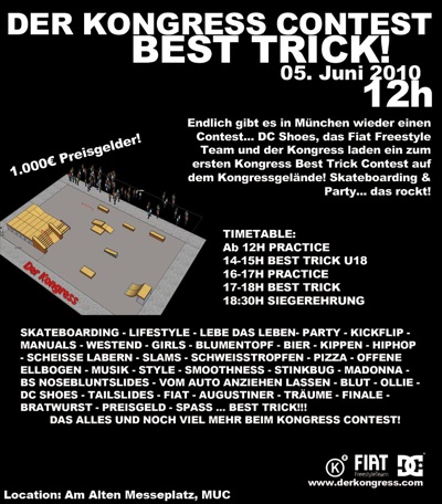 Am 5. Juni wird in München die Kuh fliegen, denn DC, Fiat und der Kongress laden ein zum ersten Best Trick Contest auf dem Kongressgelände. Neben jeder Menge Skateaction wird auch eine Party geschmissen, auf der unter anderem Blumentopf zu sehen und zu hören sein werden. Wer also in bayrischen Hauptstadt unterwegs ist, sollte sich das nicht entgehen lassen, da der Parcour vom Feinsten aussieht.