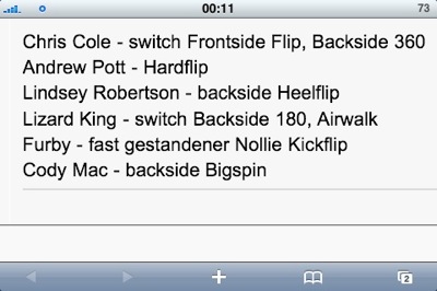 Lizard King: Backside 180 One Foot, Ollie Airwalk, Ollie to Disaster auf die letzte Stufe. Der Switch Backside 180 wurde falsch recherchiert.