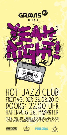 Am Freitag, den 26.03.10 findet in Münster die erste, von Gravis Skateboarding präsentierte Yeah Right! Party statt. Eine Party, die sich voll und ganz der Skateboard Musik verpflichtet fühlt. Das Yeah Right! DJ Team (Ole Rompom / Punkrock Inferno, DJ Alex / Sick Of It All) legt die besten Songs aus 30 Jahren Skateboard Videos auf und wird damit nicht nur Erinnerungen an schöne Zeiten hervorrufen, sondern auch die Tanzfläche zum Brennen bringen. Von Agent Orange bis Public Enemy, von Dinosaur Jr bis Slayer, so wie Skateboarding, wird auch die Musik an diesem Abend gut und vielseitig sein.