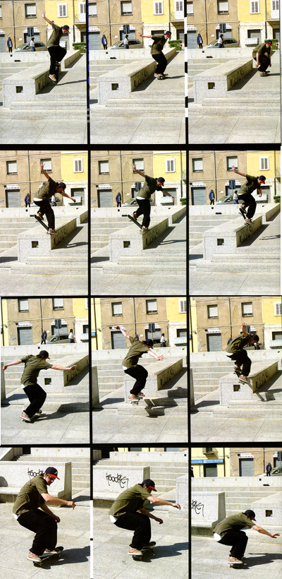 „Verdammt ist das alt! Das Cover hat damals Helge (Tscharn) gemacht und der war ja damals schon so eine berüchtigte Persönlichkeit. Es wurde immer sehr viel über ihn geredet – er sei so stressig und er baue immer gleich zig Blitze auf und erwarte immer nur das Beste von den Skatern. Man muss aber bedenken, dass das digitale Zeitalter noch nicht so fortgeschritten war wie heute und er so ziemlich der einzige Photograph der Monster war. Jedenfalls fand ich es immer cool, mit ihm zu schiessen, weil das einen natürlich auch gepusht hat, vor allem wenn Helge seine berühmte ‘Ich hab nur noch einen Film’- Lüge auftischte!”