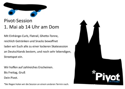 Der Pivot Skateshop lädt zur Session auf der Domplatte ein und hat auch alles, was man für eine gute Session braucht, dabei. Details könnt ihr dem Flyer entnehmen.