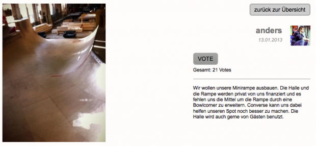 Momentan führend ist der Vorschlag von Anders Tellen, der eine Minirampe überarbeiten lassen möchte. Bis zum 30.01. kann allerdings noch gevotet werden. Also macht Vorschläge, stimmt ab und bekommt euren Spot ausgebessert und das deutsche Converse Team zu einer Eröffnungsession!