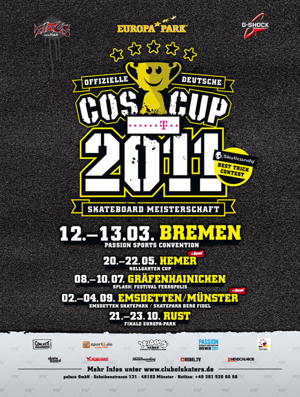 Alle Stops der Club of Skaters Cup-Serie 2011 sind ab sofort bestätigt und es kann wieder losgehen mit der offiziellen deutschen Meisterschaft im Skateboarding. Grösste Neuerung ist, dass ab sofort Bowl als Disziplin nach ein paar Jahren Pause wieder aufgenommen wurde. Ausserdem ist Ende September ein inoffizieller Stop bei der Norddeutschen Meisterschaft geplant, wo der Bowl-Meister schon gekürt wird – das Finale Street findet wieder im Europapark Rust statt.
