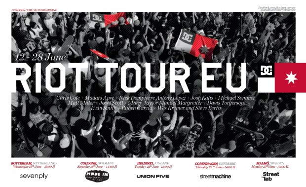 Im Rahmen ihrer „Riot Tour“ stattet das mit Superstars wie Chris Cole, Josh Kalis, Mikey Taylor, Steve Berra und Nick Dompierre gespickte DC Team auch Deutschland einen Besuch ab. Am Samstag den 18. Juni um 14 Uhr wird der Tourtross nach Köln kommen um dort ordentlich Krawall zu schlagen.