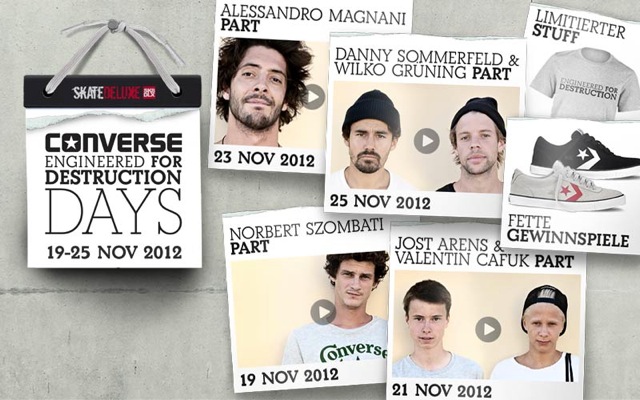 Vom 19. bis zum 25. November präsentiert Converse und skatedeluxe die Engineered for Destruction Days auf der skatedeluxe Webseite Neben den Full-Length Parts der deutschen Converse Teamfahrer, wird es dabei auch einige dicke Gewinnspiele hageln. Außerdem gibt es zu jeder Converse Schuh Bestellung ein T-Shirt gratis und ein Danny Sommerfeld Poster in jedem Paket, damit du dir Monsieur Danny an die Wand klatschen und deiner Bude somit noch mehr Style verpassen kannst. Also, Rotstift auspacken und folgendes im Kalender markieren: