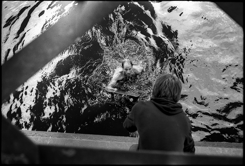 Wir waren für einen Kurzbesuch in der Hauptstadt und Tom hatte sich einen Trick am Berühmten Wallride „Berlin“ vorgenommen, an dem auch schon Kenny Anderson kratzte. Direkt hinter dem Wallride unter der Brücke fließt die Spree und Tjark und ich versuchten Toms Board vorm Ertrinken zu bewahren. Doch bei diesem einen Versuch waren wir kurz unachtsam und das Board glitt uns aus den Händen und landete im Wasser. Man muss dazu sagen, dass Herbst und keineswegs warm war. Adam zögerte allerdings nicht lange, zog blank und hüpfte in die Spree. Nach ein paar Tauchversuchen fand er schließlich Toms Board und ich machte dieses Foto. Durch die Kälte merkte Adam erst im Nachhinein, dass er sich durch lauter Scherben am Boden die Hände völlig zerschnitten hatte. Und alles für diesen einen Trick…
