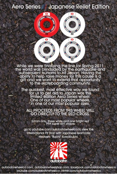 Ebenfalls das Rote Kreuz unterstützen Open Skateboards mit den Verkaufserlösen aus ihren Boards, wie auch Autobahn Wheels, die einen speziellen Satz Rollen herausgebracht haben, inklusive eines Clips mit Hirotoshi “Buchi” Kawabuchi.