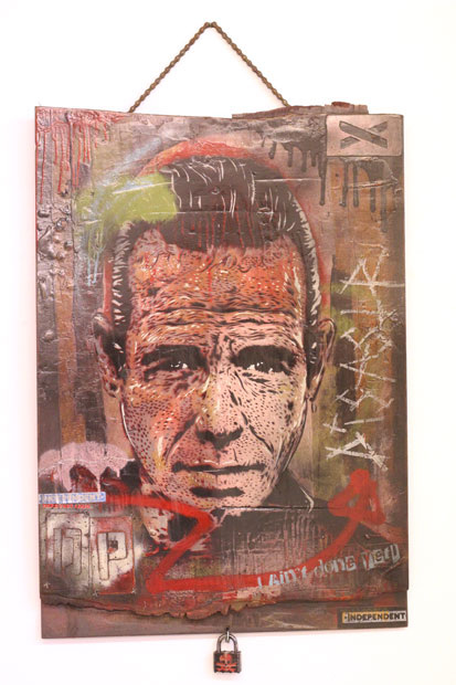 Ich werde von allen möglichen kreativen Dingen inspiriert, aber ich liebe Robert Rauschenberg. Nicht dass ich denke, meine Kunst sei wie seine, aber er war der erste Künstler den ich mochte. Ich begann in meiner Kindheit mich für so was zu interessieren und stand auf diesen ganzen Pop Art Kram, Andy Warhol und so. Dieses Wiederbeleben von Bildern, in dem man Kontraste bricht und nutzt. Und den Stencil-Künstler Logan Hicks mag ich wirklich, obwohl meine Kunst nichts mit seiner gemein hat. Dann liebe ich natürlich Sheppard Ferry, aber ich muss wirklich sehr stark aufpassen, nicht genau das zu machen, was er macht. Mein Favorit jedoch ist und bleibt Robert Rauschenberg, der inspiriert mich sehr. Ich liebe diesen Grad zwischen dem Schönen und dem Dreckigen. Das ist ein ganz kleiner Bereich in dem ich mich versuche zu bewegen und genau da verorte ich Rauschenbergs Arbeit. Ich mag das.