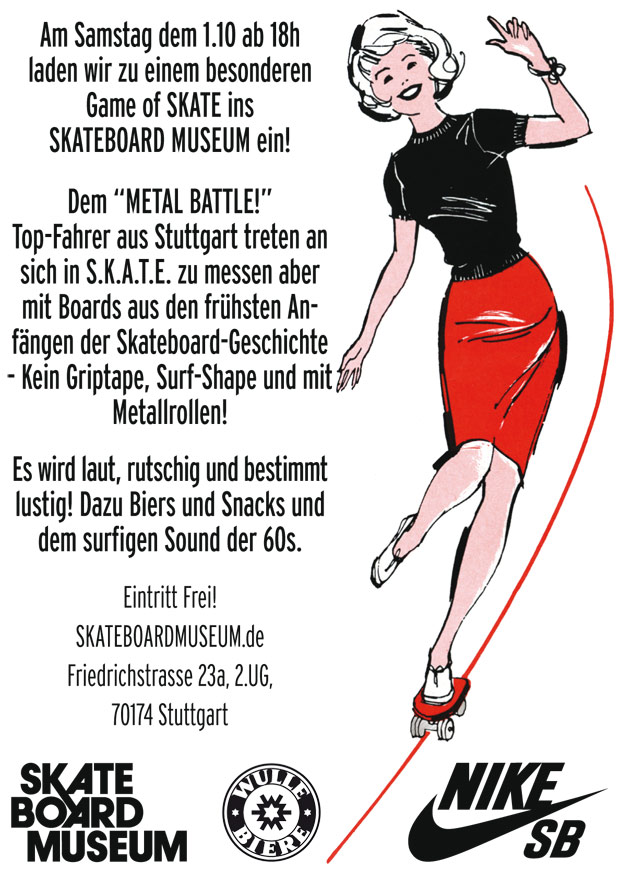 Zum Launch des Nike SB Rollerderby Dunks by Made for Skate steht am kommenden Samstag ein außergewöhnliches Game of S.K.A.T.E. im Skateboardmuseum Stuttgart an. Die dortige Knallbrettgemeinde wird antreten, um sich gegenseitig die Buchstaben nur so um die Ohren zu klatschen. Allerdings nicht mit High-End Helium-Light-Ultra-Fiber-Power-Shape Brettern heutiger Tage, sondern mit Oldtimern aus den frühsten Anfängen der Skateboard Geschichte: