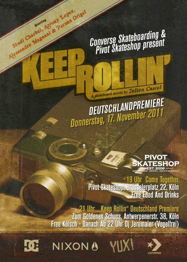 Converse und der Pivot Skateshop laden am 17. November zum Videoabend. An dem Tag findet in Köln die Deutschlandpremiere eines Projekts von Barca Filmer Julien Castel statt. Keep Rollin’ heißt der Streifen mit Shadi Charbel, Antony Lopez, Alessandro Magnani und Fernan Origel. Dass in dem Video richtig Alarm gemacht wird, dürften auch die Gastauftritte von Fahrern wie Josh Kalis, Felipe Gustavo, Raul Navarro, Charles Collet, Mark Frölich, Flo Marfaing, Kilian Zehnder und Sven Kilchenmann garantieren. Hier gibt’s einen kleinen Vorgeschmack.