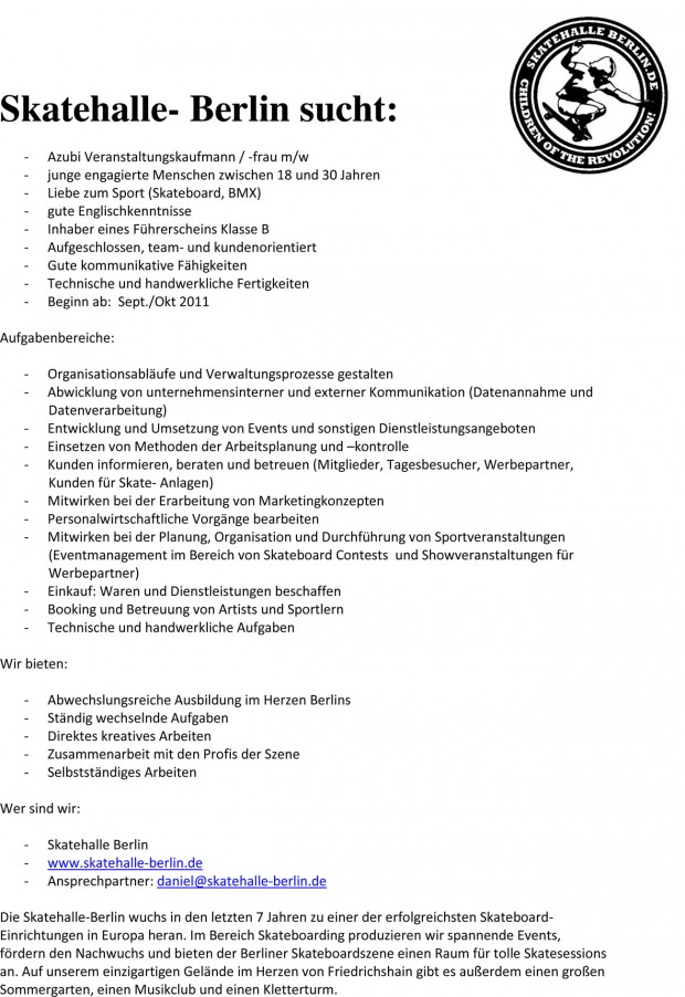 Du bist den ganzen Tag auf dem Rollbrett unterwegs, hältst dich gerne in großen, überdachten Räumen auf und in deinem Terminkalender herrscht ab September gähnende Leere? Vielleicht wird es dann Zeit für eine Lehre! Die Skatehalle Berlin hätte da nämlich genau das richtige Angebot für dich. Weitere Informationen dazu, findet ihr hier.