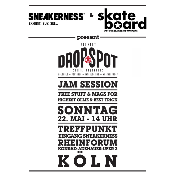 Zusammen mit unseren Freunden von Element veranstalten wir am Sonntag um 14Uhr in Köln eine kleine Skatesession. Das ganze findet im Rahmen der Sneakerness statt, einer Messe für (wer hätte es erwartet) Sneaker Enthusiasten, die am Samstag schon beginnt. Ihr könnt aber ruhig eure Skateschuhe anlassen, wir treffen uns um 14 Uhr vor der Sneakerness (gegenüber vom Musical Dom hinter dem Kölner Hauptbahnhof) und ziehen mit den verschiedenen DropSpot-Rampen in Richtung des Posse-Curbs.