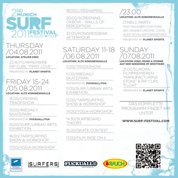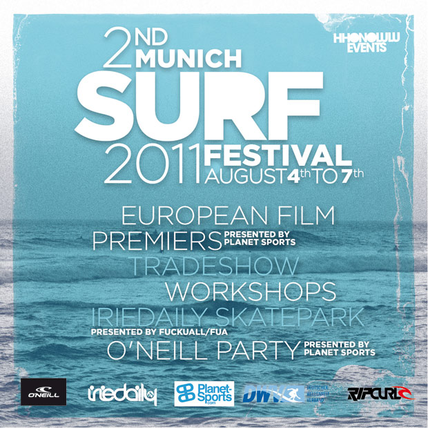 Der eine oder andere mag sich fragen, warum wir hier ein Surfevent vorstellen. Nun, einerseits bildet Surfen natürlich die Roots für Skateboarden und viele unserer Leser werfen sich im Sommer sicherlich gerne in die Wellen und andererseits gibt es auf dem zweiten Münchner „Surf Festival”, das von 4. bis 7. August stattfindet, auch einen Skatepark. Verantwortlich dafür zeichnen die Jungs von Irie Daily und laden abseits der Wellen zum fahren auf dem guten alten 7 Ply ein. Wer also im August in München ist und sich ein wenig interdisziplinär informieren möchte, für den heißt es, ab zum „Surf Festival”. Hang Loose, oder so.
