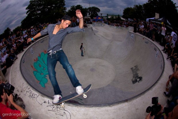 Bei bestem Skateboardwetter drängten sich die Topfahrer der internationalen Bowl-Szene um die frisch renovierte Betonlandschaft. Während Anders Tellen High-Speed Smith Grinds aufs Coping schleuderte, nahm Ben Hatchell per massivem Bs Ollie den direkten Weg aus dem Monsterbowl in die Corner. Als Hatchell am Ende des Tages auch noch einen MC Twist ins Deep End nagelte, war die Messe gelesen: 1. Platz und $2.000 Preisgeld für den US-Amerikaner.