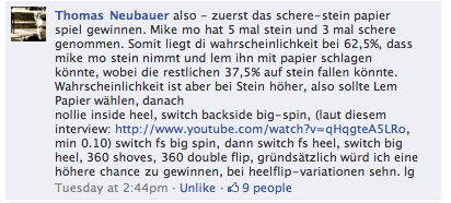Wir haben einen Gewinner! Thomas Neubauer hat mit angewandter Algebra und einem offensichtlichen Faible für Statistiken erst die beste RockPaperScissors-Quote ausgerechnet und dann netterweise auch noch einen kleinen Leitfaden für Lem mit all den Tricks formuliert, mit denen er Mike Mo Lettern auf dem Buchstabenkonto verdealen kann. Hut ab, Thomas, der Stuff ist unterwegs!