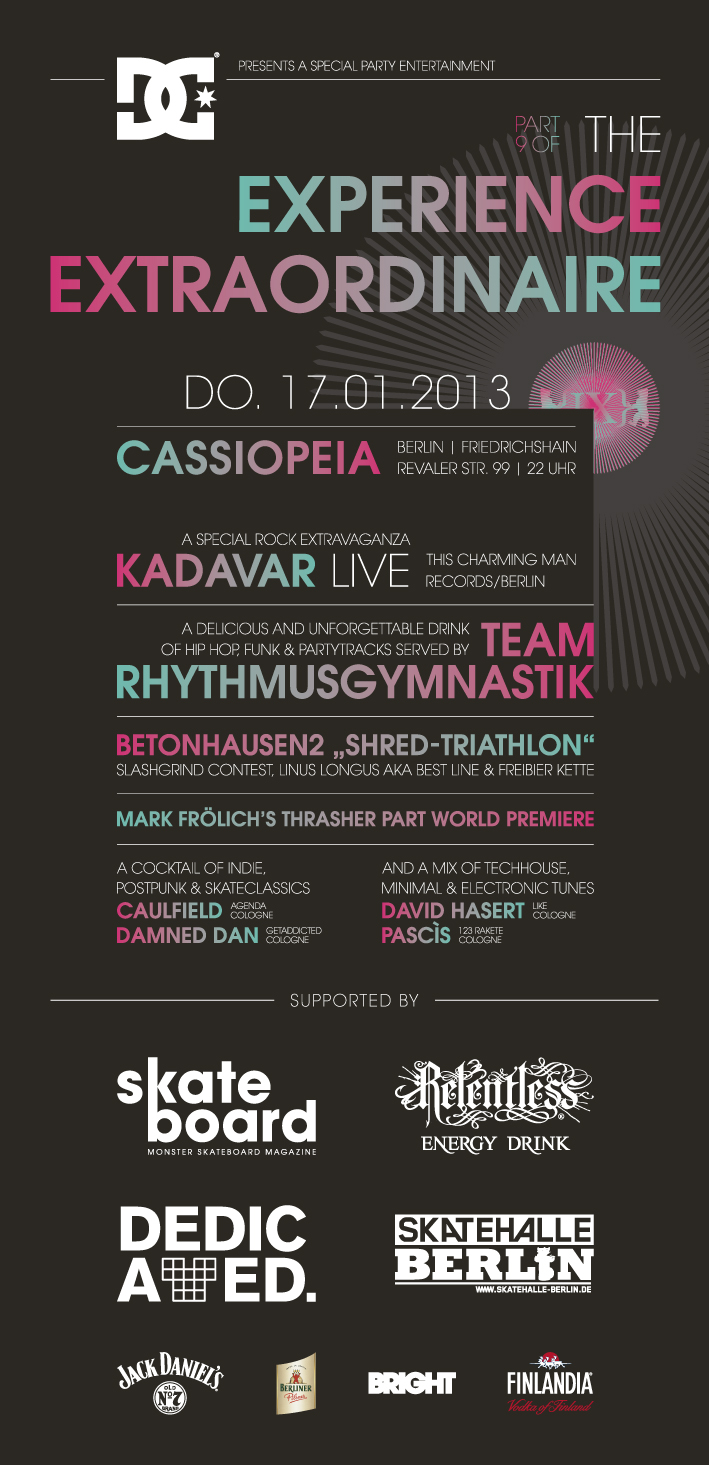Auch wenn die Bright den Standort gewechselt hat und ab diesem Jahr in Mitte beheimatet ist, findet unsere Experience Extraordinaire Party, in Zusammenarbeit mit der Skatehalle Berlin, nach wie vor im Cassiopeia statt. Am Donnerstag dem 17. Januar wird ab 22 Uhr wieder einmal die Bude abgerissen.