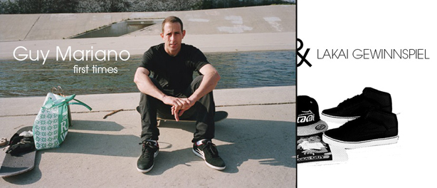 Dieses Woche haben wir mal wieder etwas ganz Besonderes für euch. Neben dem Gewinnspiel spricht mit Guy Mariano nämlich auch noch einer der begnadetsten Skateboarder unserer Zeit von seinen ersten Malen. Er erzählt dabei z.B., dass seine erste Aktion nach erlangen des Pro Status ein dicker Einkaufsbummel war. Und da Guy genau weiß, wie gerne man sich die Taschen voll macht, will er nun euch die Möglichkeit geben feinsten Stuff abzustauben. Da gibt es Guy Mariano Schuhe, Cap und Shirt von Lakai zu gewinnen. Wir suchen also drei Mariano Fans, die beschenkt werden wollen. Alles was ihr dafür tun müsst ist die Frage nach dem Kurzinterview zu beantworten.