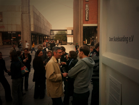 Im Rahmen der Plan 09, dem Kölner Architektur Festival, steht noch bis zum 2. Oktober ein ausgebauter Container auf der Domplatte, in dem der Dom Skateboarding e.V. zum einen gesammelte Fotografien der letzten 20 Jahren Skateboarding auf der Domplatte zeigt und zum anderen das Projekt des Skateplazas am Kölner Kap am Südkai präsentiert, das nächstes Jahr als Dom-Alternative mit der Stadt Köln umgesetzt werden soll.