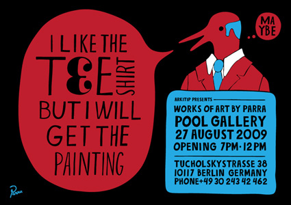 Vom 28. August bis zum 10. Oktober ist Parra mit der Ausstellung “I Like The Tee Shirt But I Will Get The Painting” in der Berliner Pool Gallery zu Gast. Die Eröffnung ist morgen am 27. August ab 19:00Uhr.