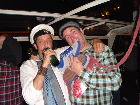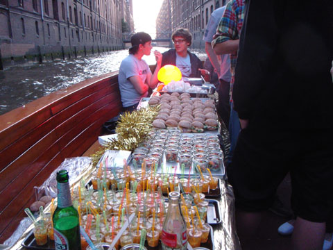 Nachdem der Kahn mit gefühlten 1000 Leuten gegen 19h von den Landungsbrücken zunächst in Richtung Speicherstadt in die Elbe gestochen war, eröffnete Cpt. Clepto das Buffet inkl. Aal am Stiel und gab offiziell den Zugriff auf die Getränke frei.