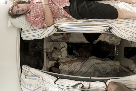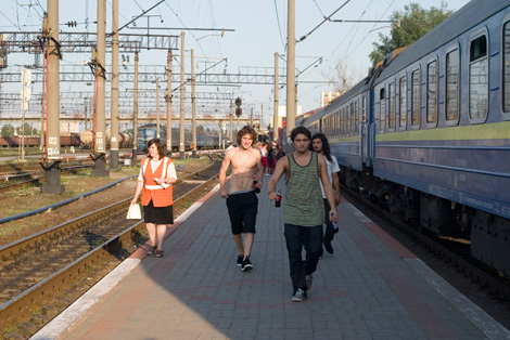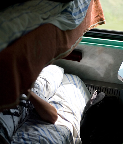 Unser erster Zugabschnitt ging von Berlin-Lichtenberg nach Kiew, in einem Zug, der seine russische Herkunft nicht verbirgt. Durchgetretene Perser-Teppiche im Gang und eine antike Kabinenausstattung liessen Ostblock-Flair aufkommen. Und bei 3m2 Kabinen für 3 Leute erübrigte sich jegliche Frage nach Komfort.