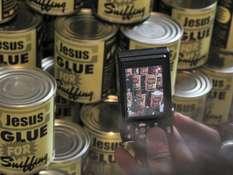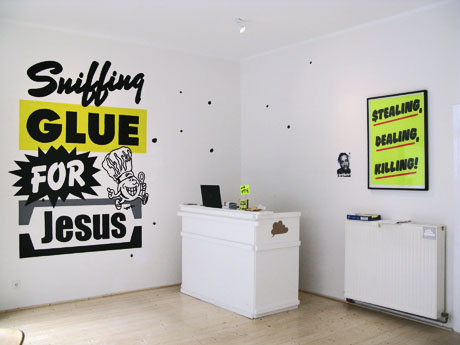 Am vergangenen Samstag war die Vernissage der Ausstellung “Sniffing Glue for Jesus” von Ben Wes & Ole Utikal in der Galerie “Nina sagt…” zu Düsseldorf. Da Ben nicht nur Skateboarder und des öfteren in unserem Heft vertreten, sondern auch ein guter Freund des Hauses ist, waren wir natürlich vor Ort, um mit einer ordentlichen Dose Erbsensuppe auf eine gelungene Ausstellungseröffnung anzustossen. Wer auch mal vorbeischauen will, hat dazu noch bis zum 14.08 Zeit (mehr Informationen gibt es unter Nina sagt…).