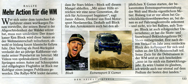 Im Spiegel von letzter Woche findet sich dieser News-Fetzen über fehlende Stars in der Rallye-Szene und deren vermeintlichen Retter: DC-Mitgründer Ken Block. Warum sich die Organisatoren der Rallye-WM so auf den Heilsbringer freuen, verrät u.a. dieser Clip. Parallelen zu DC´s bestem Pferd im Stall sind wohl rein zufällig…