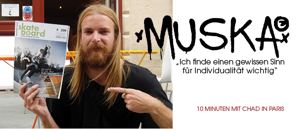 Mit fliegenden Haaren und wallendem Bart rollte er wie ein Endzeitjesus, auf seinem vollgetagtem Brett heran. Städtenamen hatte er mit weißen Edding auf das Griptape geschrieben. Namen der Metropolen zwischen denen er stetig pendelt, wie normale Menschen zwischen Arbeitsplatz, Supermarkt und Wohnzimmercouch. Ein paar Minuten haben wir es geschafft uns auf den Stufen des Museums mit dem Muska nieder zu lassen, um mit ihm über Kunst, Mode und die Zukunft von Skateboarding zu sprechen, bevor er zurück auf sein Board sprang und wieder pushend im Verkehr der Pariser Rush Hour verschwand.