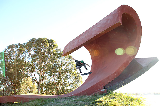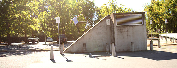 „In den letzten Tagen sind wir ein bisschen in den Vororten von Canberra rumgeskatet und lasst euch eines sagen: Diese Stadt ist der Knaller! Fast so ein Knaller wie Günnis superflare switch Treflips an diesem Spot – ein Parkplatz, den wir im Vorbeifahren gefunden haben.“