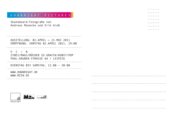 Freund des Hauses Erik Groß besticht nicht nur im kunstvollen Umgang mit seinem Brett, sondern ist mindestens ebenso gewandt in der Handhabung seiner Photokamera. Der eine oder andere hat vielleicht auf seinem Photoblog oder in unserer Ausgabe #288, in der er sein „Shoot“ mit aussergewöhnlich schönen Bildern füllte, bereits kleine Einblicke in sein vielfältiges Schaffen erhalten. Nun allerdings steht eine gesammelte Ausstellung mit Skateboard-Photographie an, die den Titel „Downright Pictures“ trägt. Von 02. April bis 21. Mai stellt Erik zusammen mit Andreas Manecke in der MZIN Galerie in Leipzig seine Bilder aus. Eröffnung ist am Samstag den 02.03 um 19.00 Uhr und wer im Umkreis wohnt, sollte sich das keinesfalls entgehen lassen.