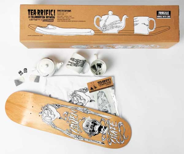Nun gibt es Deck, Sticker, Tassen, Kanne, Teebeutel und natürlich auch ein Tea Shirt (kleiner Spaß) passend für den rollbrettaffinen Heißwasserfreund. Wer jetzt Lust bekommen hat auf eine stilvolle Teepause, der sollte schnell handeln. Denn die hier erhältlichen Komplettsets sind streng limitiert.