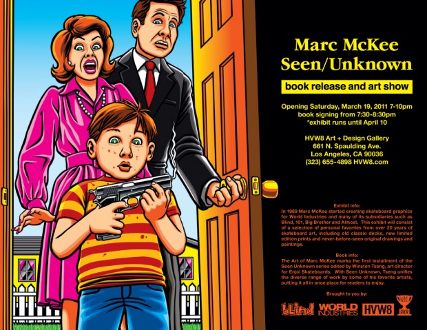 Marc McKee ist einer der bedeutendsten Künstler in der Skatewelt. Er gestaltete in den 90ern eben so berühmte wie kontroverse Deckgrafiken für World Industries, Blind und einige mehr. Jason Lee’s Burger King Board oder die Fucked Up Blind Kids etwa sind von ihm. Später arbeitete er für das Big Brother Magazine und nun bringt Winston Tseng, seines Zeichens Art Director bei Enjoi, in seiner Reihe „Seen Unknown“ ein Buch mit dem Titel „Warning: The Art of Marc McKee“ heraus, welches seine gesammelten Arbeiten enthält. Vorgestellt wird das Buch standesgemäß mit einer Ausstellung.