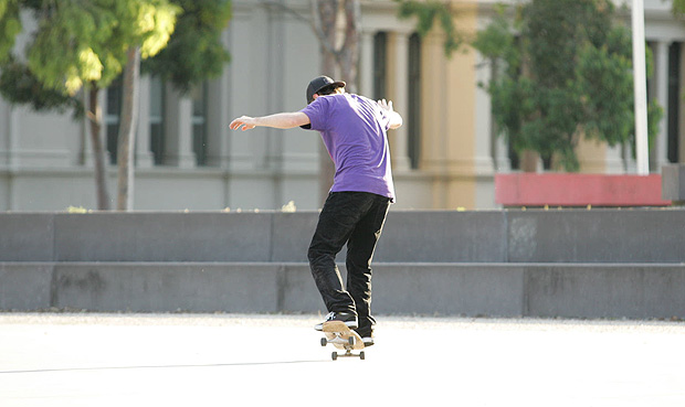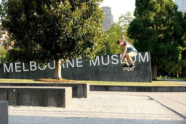 „Wir hatten ein paar Tage zum Rumrollen. Der erste Spot war natürlich das stets berühmte IMAX-Kino in Melbourne mit den etlichen Schotter-Gaps, die ihr schon viele Leute habt runterspringen sehen – oder hoch, je nach Skater.“