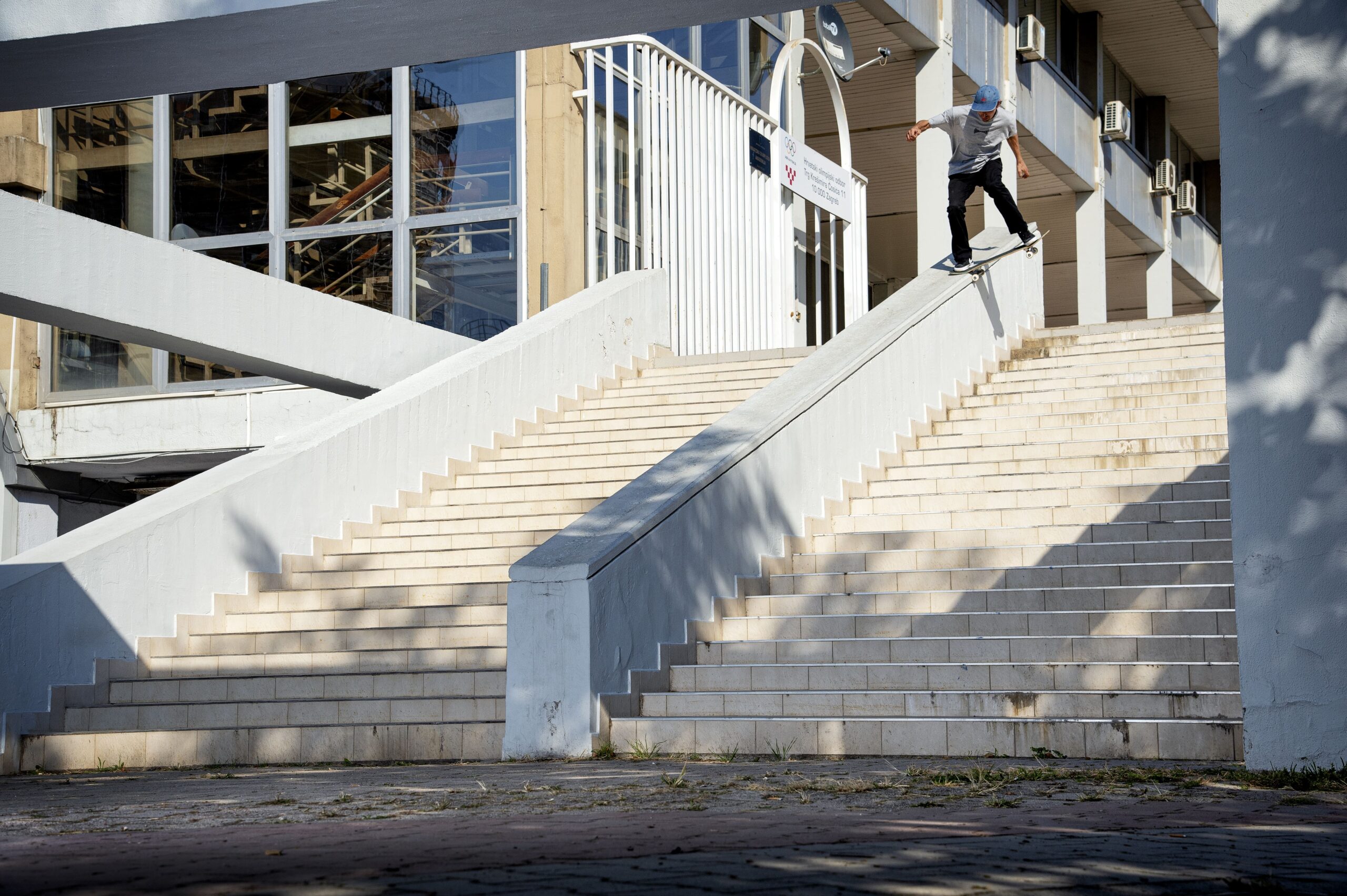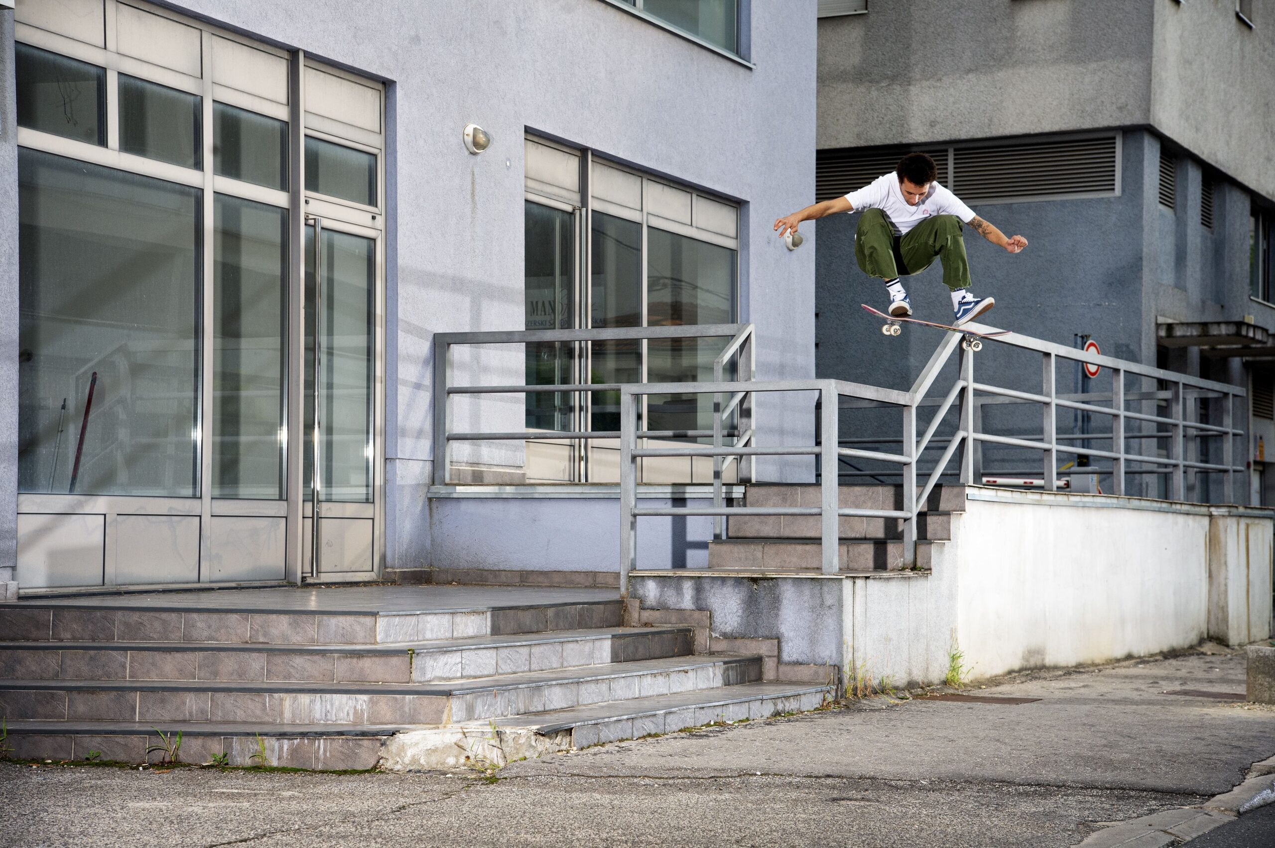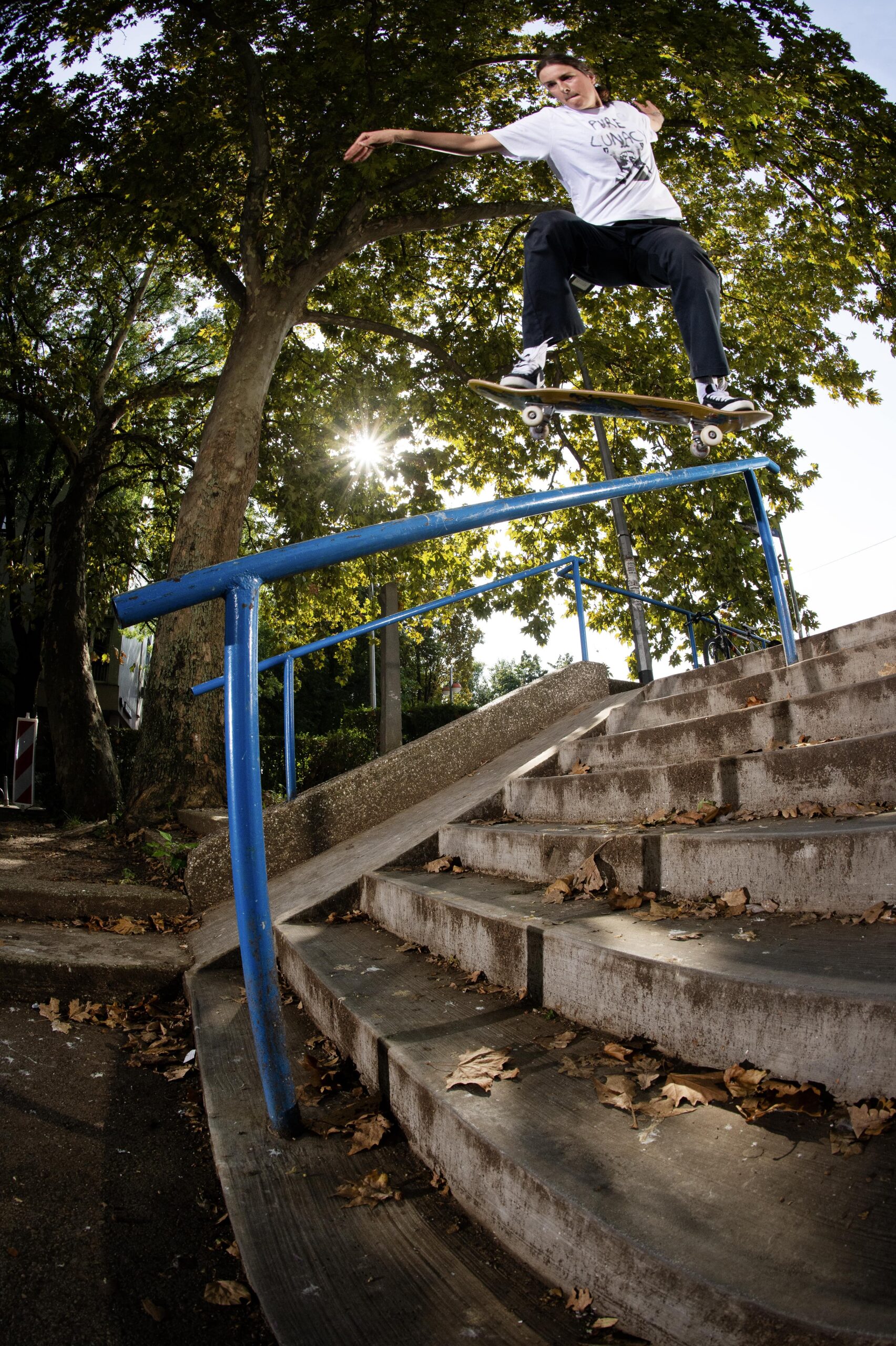 Daniel fand den Spot auf dem Weg zum Einkaufen. Es ist derselbe Spot, an dem Eniz den langen 50/50 und Emil den Boardslide im Video gemacht haben. Dummerweise blockierten drei Autos die Landung. Eniz und Emil machten sich an die Arbeit, was einige Zeit dauern sollte. In der Zwischenzeit versuchte Daniel sich an Telepathie und verfolgte jeden Passanten mit Adleraugen, immer in der Hoffnung, diese Autos endlich los zuwerden, aber es fruchtete nur wenig. Drei Stunden Wartezeit und Tricks von Eniz, Emil und Kuba später war Daniel so motiviert, dass er am Ende nur drei oder vier Versuche benötigte.