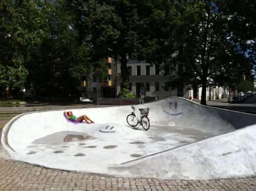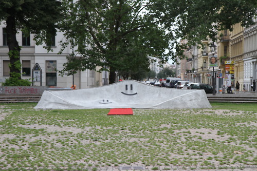 Das kreative Multitalent Dave the Chimp hat im Rahmen dessen jetzt die erste Skulptur geschaffen, die den schönen Titel „Papa und Ich” trägt. Das tolle daran ist, dass das Ding hauptsächlich dafür gemacht wurde, um geskatet zu werden. Nebenbei soll sie zwar auch die Aufmerksamkeit von Passanten erregen um sie in das Künstlerhaus zu locken, vorrangig dürfte sie aber Skateboarder anziehen, die auf ihrem Brett ganz schnell und intuitiv den tieferen Sinn der Skultpur, nämlich die Darstellung von Freude und Freiheit, verstehen werden.